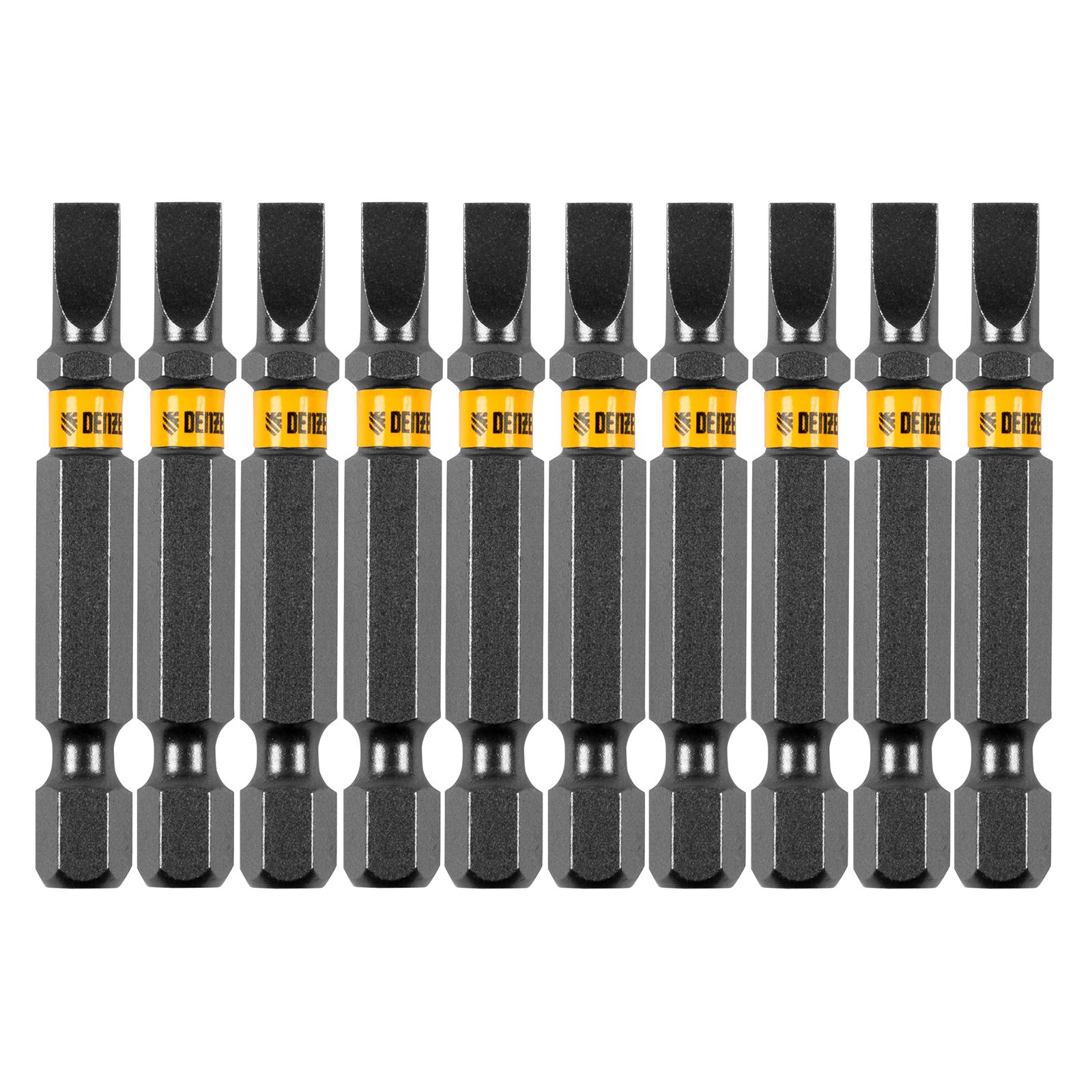 Набор бит SL 5,0 х 50 мм Denzel 11659 включает в себя 10 сменных насадок из стали S2 для шуруповертов и отверток-адаптеров с присоединительным шестигранником 1/4". Биты со шлицами «минус» размером 5 мм применяются при монтаже и демонтаже резьбовых соединений: винтов, саморезов и др.