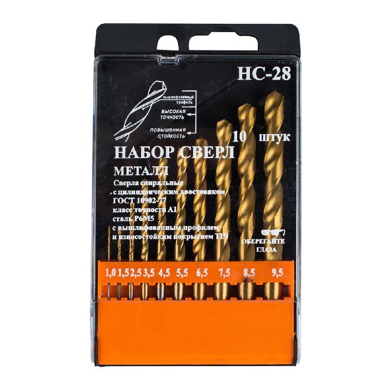 Набор сверл по металлу НС28 от 1 до 9,5 шаг 0,5-1, 10шт. Р6М5 TiN