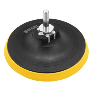 Тарелка опорная Denzel 76250 диаметром 115 мм, с липучкой и адаптером с М14 на d8, стандартная, устанавливается на дрель или углошлифовальную машину (УШМ). Используется для крепления абразивных или полировальных кругов на ворсовой основе, позволяет подготовить поверхность для дальнейшей обработки или придать ей финишную гладкость.