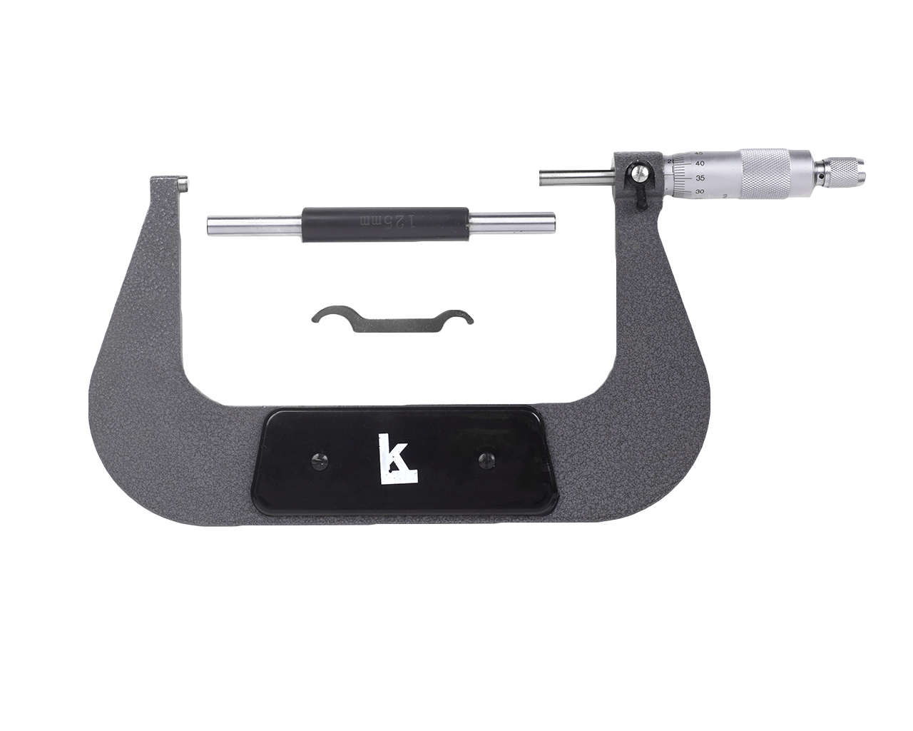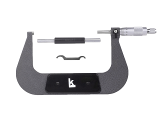 Микрометр МК- 150 0,01 КЛБ* — средство для измерения наружных линейных размеров. Основанием микрометра является скоба, а преобразующим устройством служит винтовая пара, состоящая из микрометрического винта и микрометрической гайки, укреплённой внутри стебля; их часто называют микропарой. В скобу запрессованы пятка и стебель. Измеряемую деталь охватывают торцевыми измерительными поверхностями микровинта и пятки. Барабан присоединён к микровинту с помощью колпачка в котором находится корпус трещотки. Чтобы приблизить микровинт к пятке, вращают барабан трещотку по часовой стрелке (от себя), а для обратного движения микровинта (от пятки) барабан вращают против часовой стрелки (на себя). Закрепляют микровинт в требуемом положении стопором.