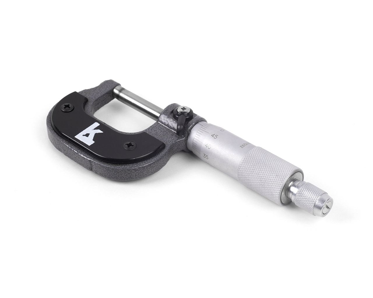 Микрометр МК- 25 0,01 КЛБ* — средство для измерения наружных линейных размеров. Основанием микрометра является скоба, а преобразующим устройством служит винтовая пара, состоящая из микрометрического винта и микрометрической гайки, укреплённой внутри стебля; их часто называют микропарой. В скобу запрессованы пятка и стебель. Измеряемую деталь охватывают торцевыми измерительными поверхностями микровинта и пятки. Барабан присоединён к микровинту с помощью колпачка в котором находится корпус трещотки. Чтобы приблизить микровинт к пятке, вращают барабан трещотку по часовой стрелке (от себя), а для обратного движения микровинта (от пятки) барабан вращают против часовой стрелки (на себя). Закрепляют микровинт в требуемом положении стопором.