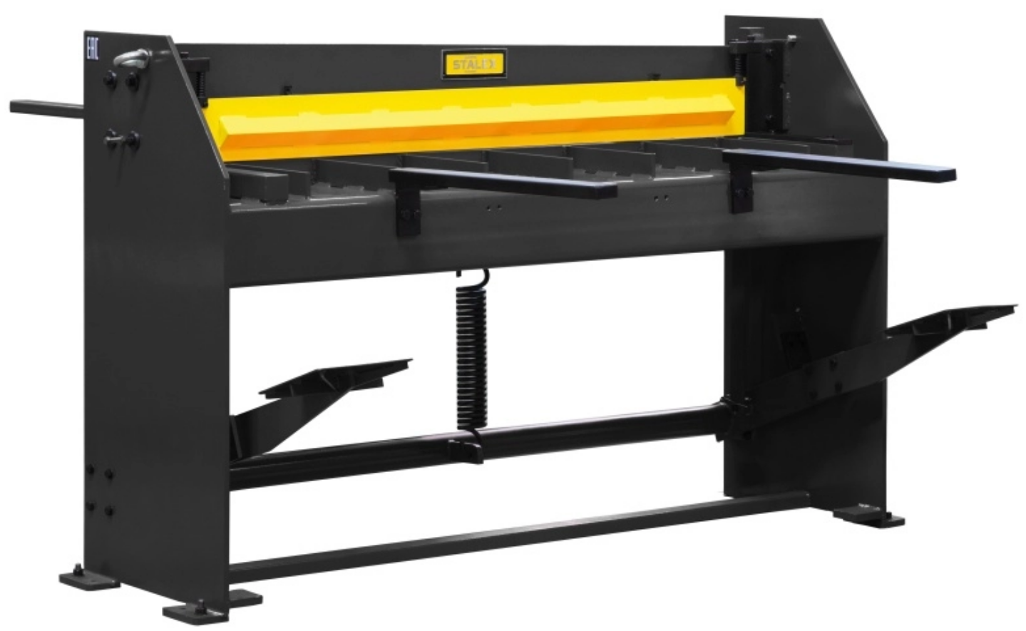 Модель оснащена резаками из высокоуглеродистой стали и механизмом надежного прижима листа. Гильотина имеет ограничитель глубины подачи заготовки до 800 мм и ножную педаль.