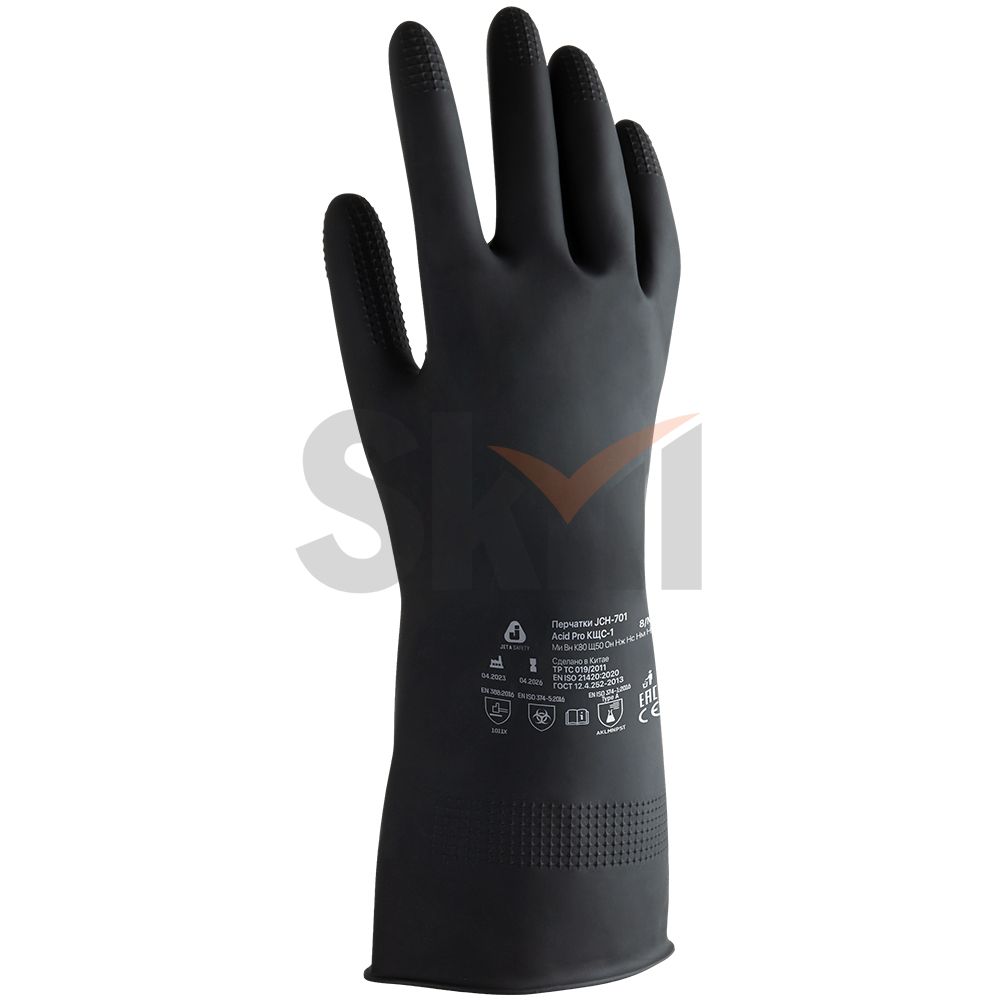 JETA SAFETY JCH-701 Acid Pro КЩС-1 – прочные перчатки из латекса для защиты от химических воздействий. Предназначены для работы со смолами, растворителями, кислотами, солями, сборки обезжиренных деталей, химической обработки поверхностей, промышленного клининга, окрашивания распылителем, технического обслуживания, чистки и обезжиривания с использованием химических веществ.