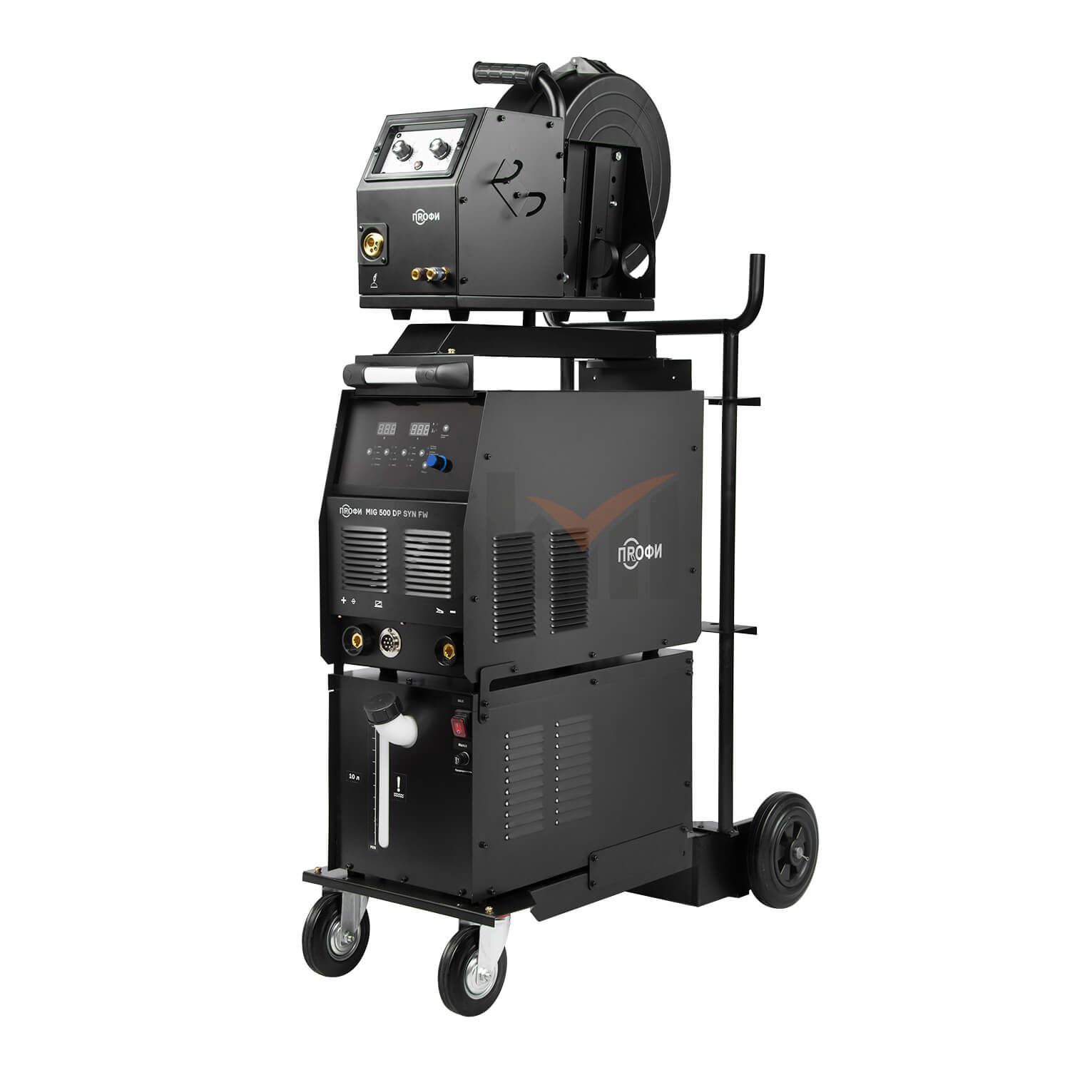 Полуавтомат ПРОФИ MIG 500 DP SYN FW поставляется с блоком водяного охлаждения объемом до 10 литров и с тележкой-платформой, для легкого и комфортного перемещения и эксплуатацию оборудования. Тележка оснащена надежной усиленной конструкцией. На нее можно установить сварочный источник, выносной подающий механизм, блок жидкостного охлаждения и газовый баллон объемом 40 литров.