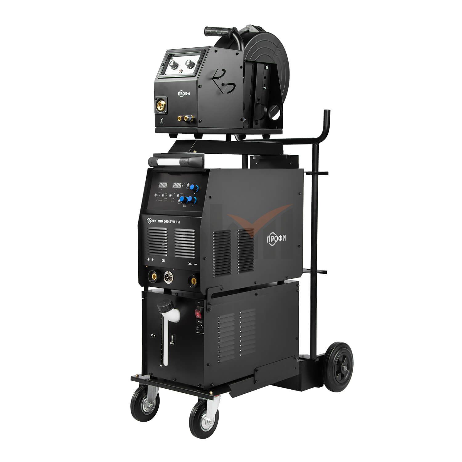 Полуавтомат ПРОФИ MIG 500 SYN FW поставляется с блоком водяного охлаждения объемом до 10 литров и с тележкой-платформой, для легкого и комфортного перемещения и эксплуатацию оборудования. Тележка оснащена надежной усиленной конструкцией. На нее можно установить сварочный источник, выносной подающий механизм, блок жидкостного охлаждения и газовый баллон объемом 40 литров.