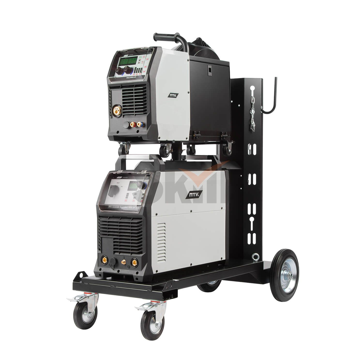 Аппарат поставляется в комплекте с тележкой для перемещения аппарата, подающего механизма и баллона с защитным газом. Тележка обладает надежной усиленной конструкцией, где толщина металла около 3 мм.