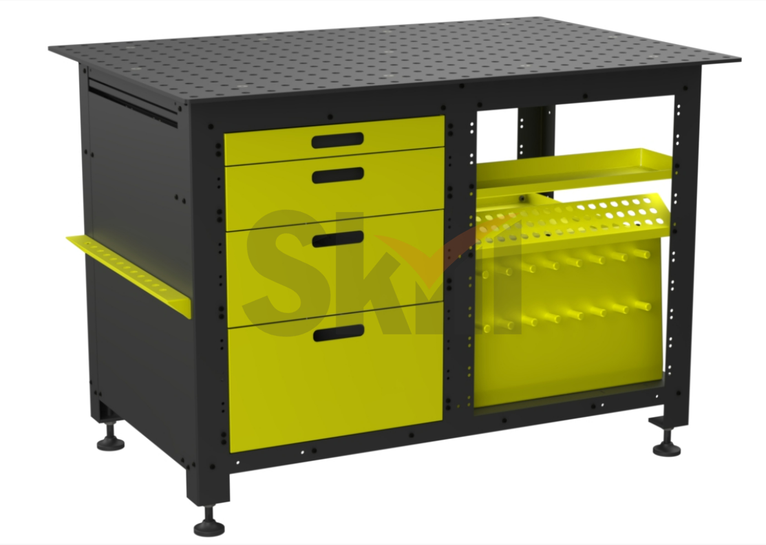 Рабочий верстак обеспечивает пространство для хранения оснастки. Разные аксессуары хранятся на специальных полках, таким образом находятся в пределах доступности, что обеспечивает порядок на рабочем месте. Столешница азотированная, толщина столешницы 8 мм.