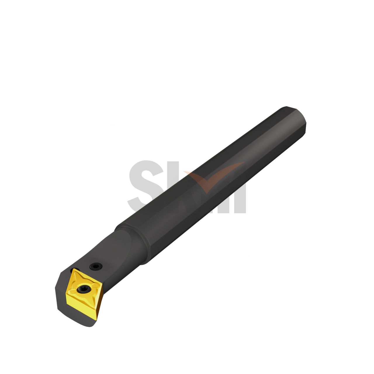 Токарная расточная державка для пластин типа DN..1506. Предназначена для продольного, поперечного и контурного точения. Минимальный диаметр точения составляет 40 мм. Прижим рычагом за отверстие типа Р обеспечивает удобную и быструю смену режущей пластины, а также не препятствует эвакуации стружки. Без подвода СОЖ. Правое исполнение.