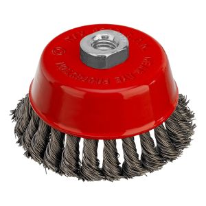 Щетка Matrix «Чашка» 74628 диаметром 100 мм, с присоединительной резьбой М14, с щетиной из крученой проволоки диаметром 0,5 мм, устанавливается на УШМ, поддерживающую работу со скоростью 8500 об/мин. Изделие предназначено для грубой (черновой) обработки поверхностей и подходит для удаления загрязнений, снятия толстого слоя ржавчины, ЛКМ, зачистки сварных швов.