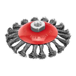 Щетка Matrix «тарелка» 74610 диаметром 115 мм, с щетиной из крученой проволоки толщиной 0,5 мм, устанавливается на УШМ при помощи гайки М14. Выполнена в форме тарелки, за счет чего подходит для грубой (черновой) обработки плоских и угловых поверхностей. Удаляет ржавчину, загрязнения, лакокрасочные покрытия, подходит для зачистки сварных швов. Использование на скорости до 12500 об/мин позволяет продлить срок службы насадки.