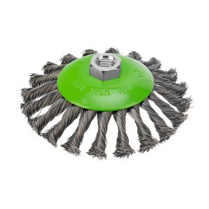 Щетка Сибртех «тарелка» 746117 диаметром 125 мм, с щетиной из крученой проволоки толщиной 0,5 мм, устанавливается на УШМ при помощи гайки М14. Выполнена в форме тарелки, за счет чего подходит для грубой (черновой) обработки плоских и угловых поверхностей. Удаляет ржавчину, загрязнения, лакокрасочные покрытия, подходит для зачистки сварных швов. Использование на скорости до 12500 об/мин позволяет продлить срок службы насадки.