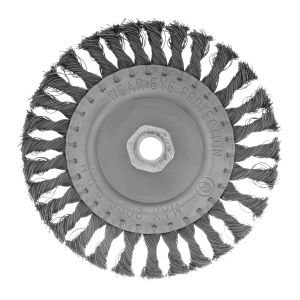 Плоская щетка Matrix 74635 диаметром 150 мм, с щетиной из крученой проволоки толщиной 0,35 мм и гайкой М14, — оснастка для УШМ, предназначенная для грубой (черновой) обработки поверхностей. Максимально допустимая скорость вращения шпинделя — 9000 об/мин. Щетка позволяет снять толстый слой ржавчины, лакокрасочных покрытий, загрязнений, а также зачистить сварные швы. Плоская форма удобна для обработки углов, изгибов и других труднодоступных мест.
