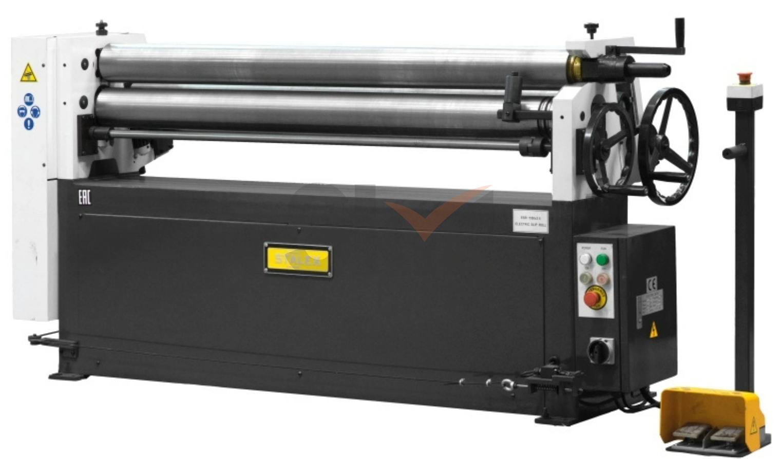 Вальцовочный станок предназначен для предания листу цилиндрической формы различного радиуса, данное оборудование широко применяется для изготовления комплектующих вентиляции, водосточного оборудования, в случаях производства цилиндрических и конических изделий, правке плоских заготовок, подгибке кромок. Выносная педаль дублируется пультом управления на станине станка. Цепная передача передаёт вращение с электродвигателя на валы. Верхний вал откидной, для легкого снятия готовых изделий. Откидной вал оснащен замком для предотвращения его самопроизвольного раскрытия в процессе работы.
