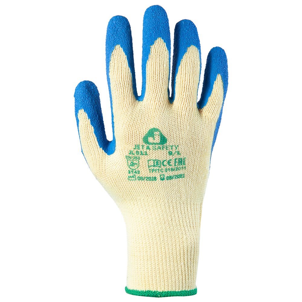 JETA SAFETY JL011 — бесшовные вязаные перчатки из поликоттона (хлопок, полиэфир). На ладони и пальцах нанесено тонкое рельефное латексное покрытие для надежного захвата сухих и влажных предметов. Улучшенный воздухообмен обеспечивается благодаря отсутствию покрытия на тыльной стороне ладони. Эластичная манжета надежно удерживает перчатку на запястье.