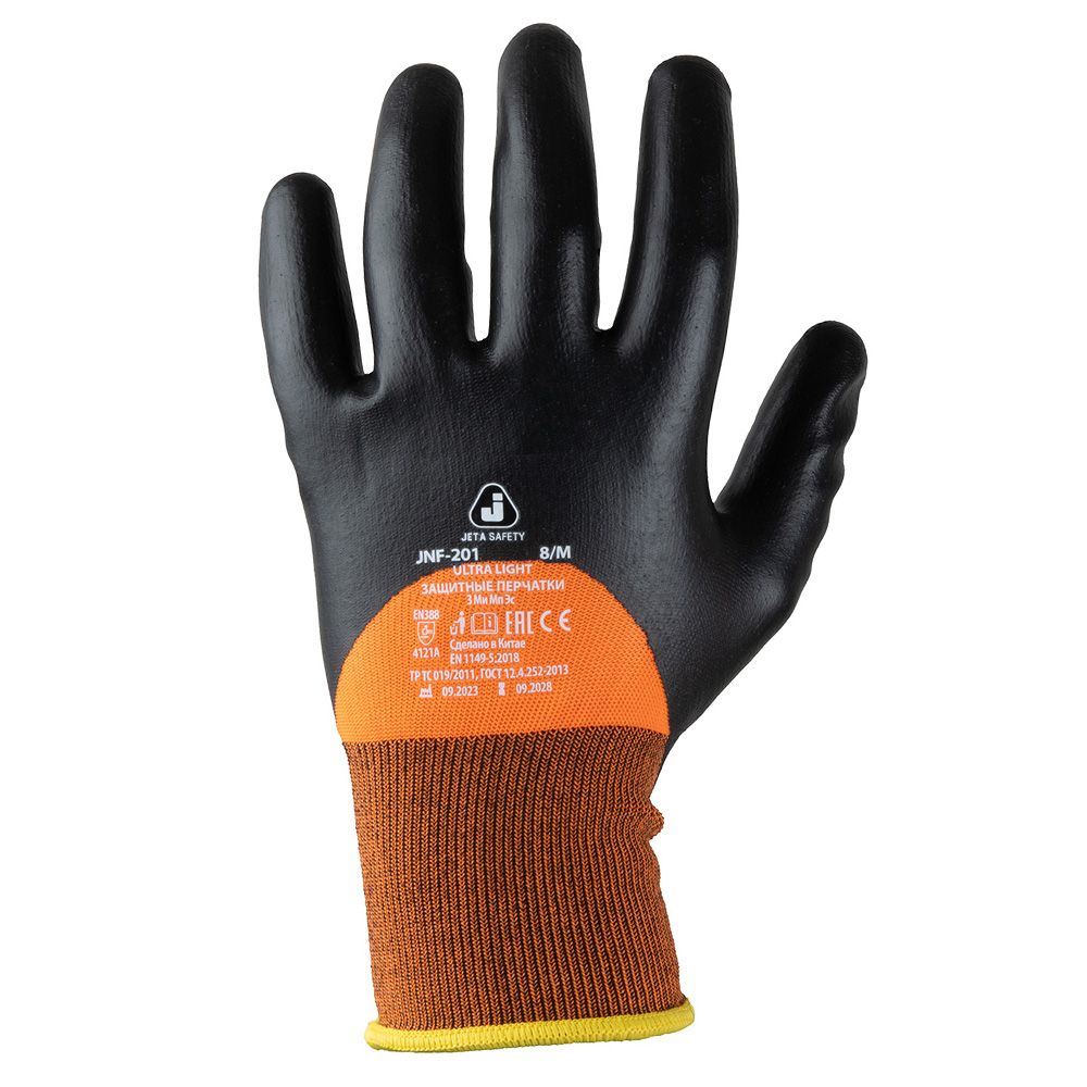 JETA SAFETY JNF-201 Ultra Light — защитные трикотажные перчатки с пенонитриловым покрытием на 3/4 от всех площади поверхности. Имеют яркий сигнальный цвет. Обеспечивают отличный хват. Плотная манжета отлично фиксирует изделие на руке. Универсальная модель и подходит для работ, связанных с повышенным количеством загрязнений, влаги и воды, работы с маслами, смазками и нефтепродуктами в ограниченном количестве. Используется в сборочно-монтажных работах, работах операторов машин и механизмов, строительно-конструкторских работах, столярных работах, а также в машиностроении, транспортировочных, складских и ремонтных работах.