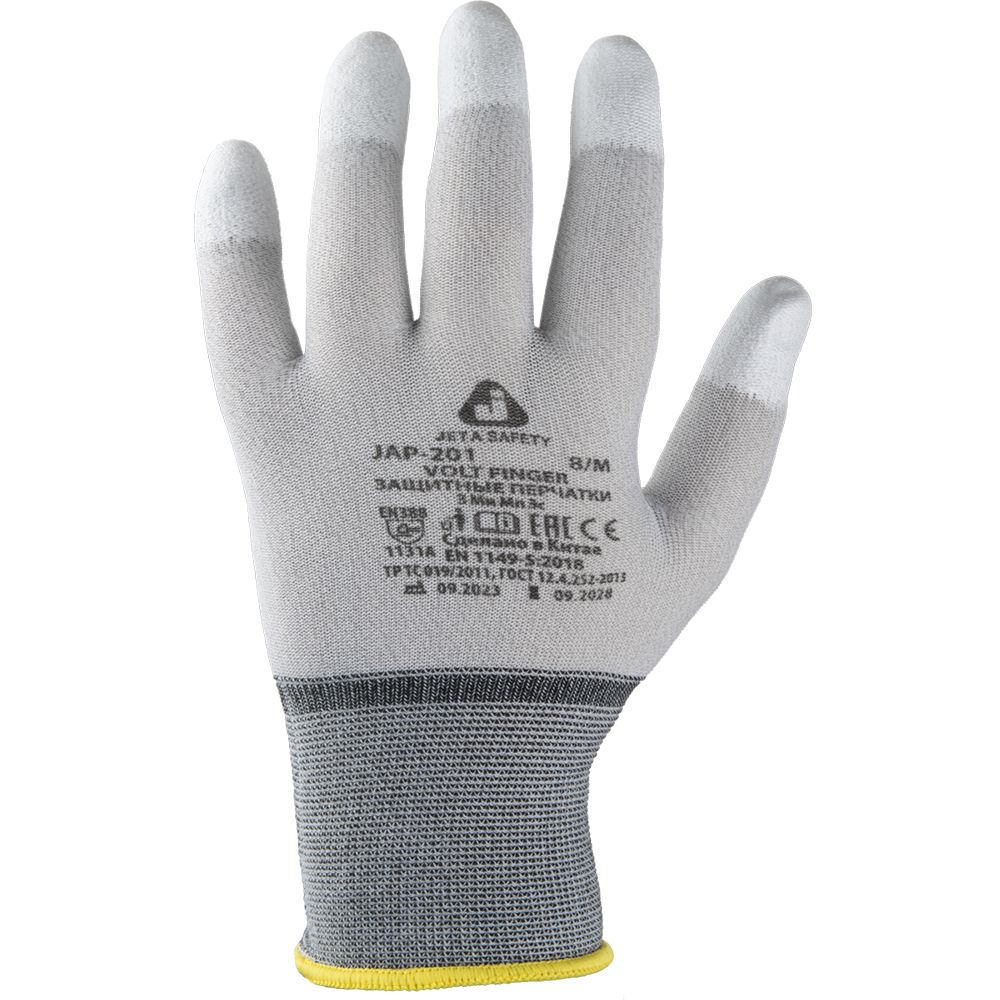 JETA SAFETY JAP-201 Volt Finger – трикотажные перчатки с покрытием из 100% полиуретана на кончиках пальцев и углеродной нитью. Отлично подходят для точных сборочных работ (в том числе электроники), а также для фармацевтики, взаимодействия с легковоспламеняющимися веществами и чистыми поверхностями. Основа выполнена из 70% полиэфира, 30% карбона 18 класса вязки.