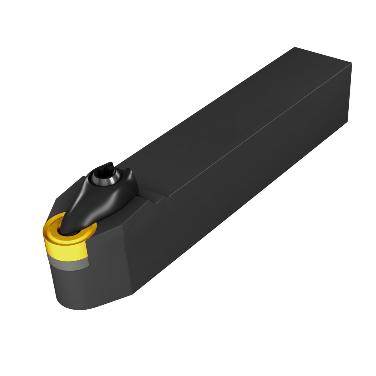 Токарная державка для пластин без отверстия типа SN••12. Крепление типа С предназначено преимущественно для керамических пластин. Обеспечивает жесткий зажим пластины кронштейном сверху. Угол в плане составляет 45°. Предназначена для продольного и контурного точения.