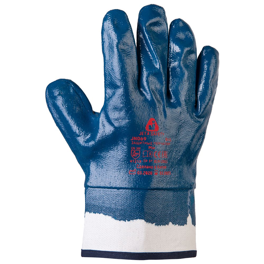 JETA SAFETY JN069 – защитные краги с полным маслобензостойким нитриловым покрытием для грубой и тяжелой работы. Джерсовая подкладка выполнена из 100% хлопка. Защитная манжета-крага не сковывает движений запястья. Максимально высокий уровень износоустойчивости. Защита от проколов/порезов, воды, нефтепродуктов.