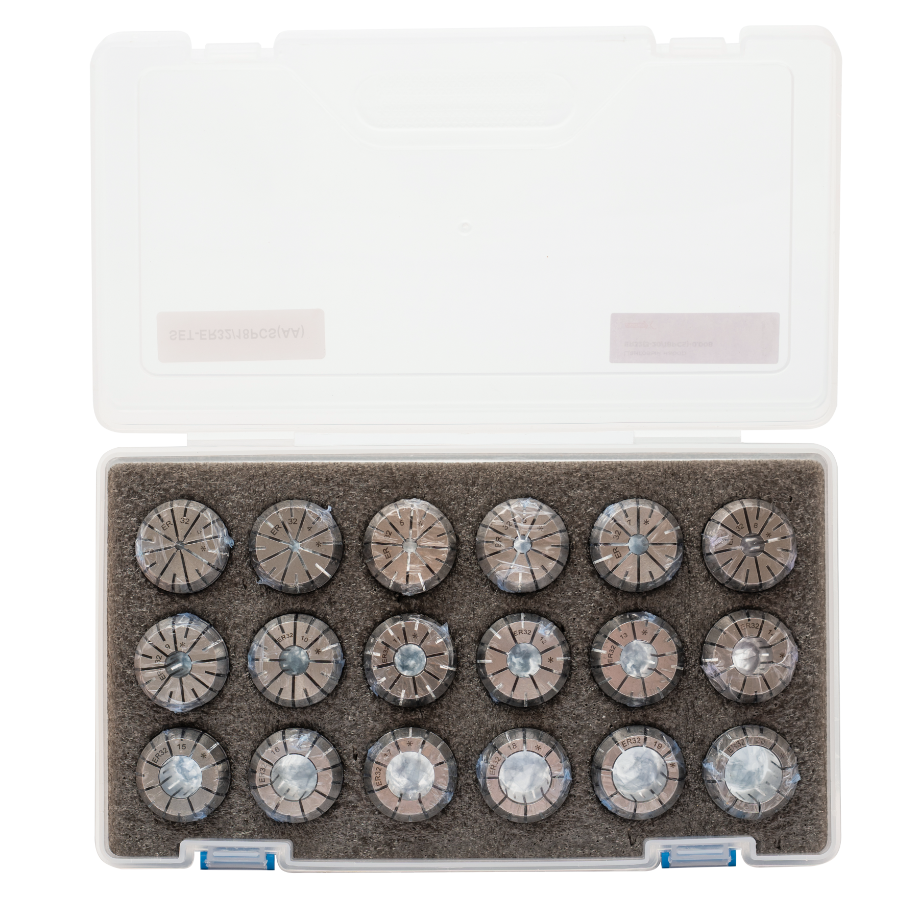 Набор состоит из особо точных цанг ER40, пластикового кейса и мягкого ложемента в котором располагаются цанги. Сами цанги соответствуют стандарту ISO 15488 (в замен устаревшему DIN6499) имеют форму В (12-16 прорезей) и не имеют подвод СОЖ.