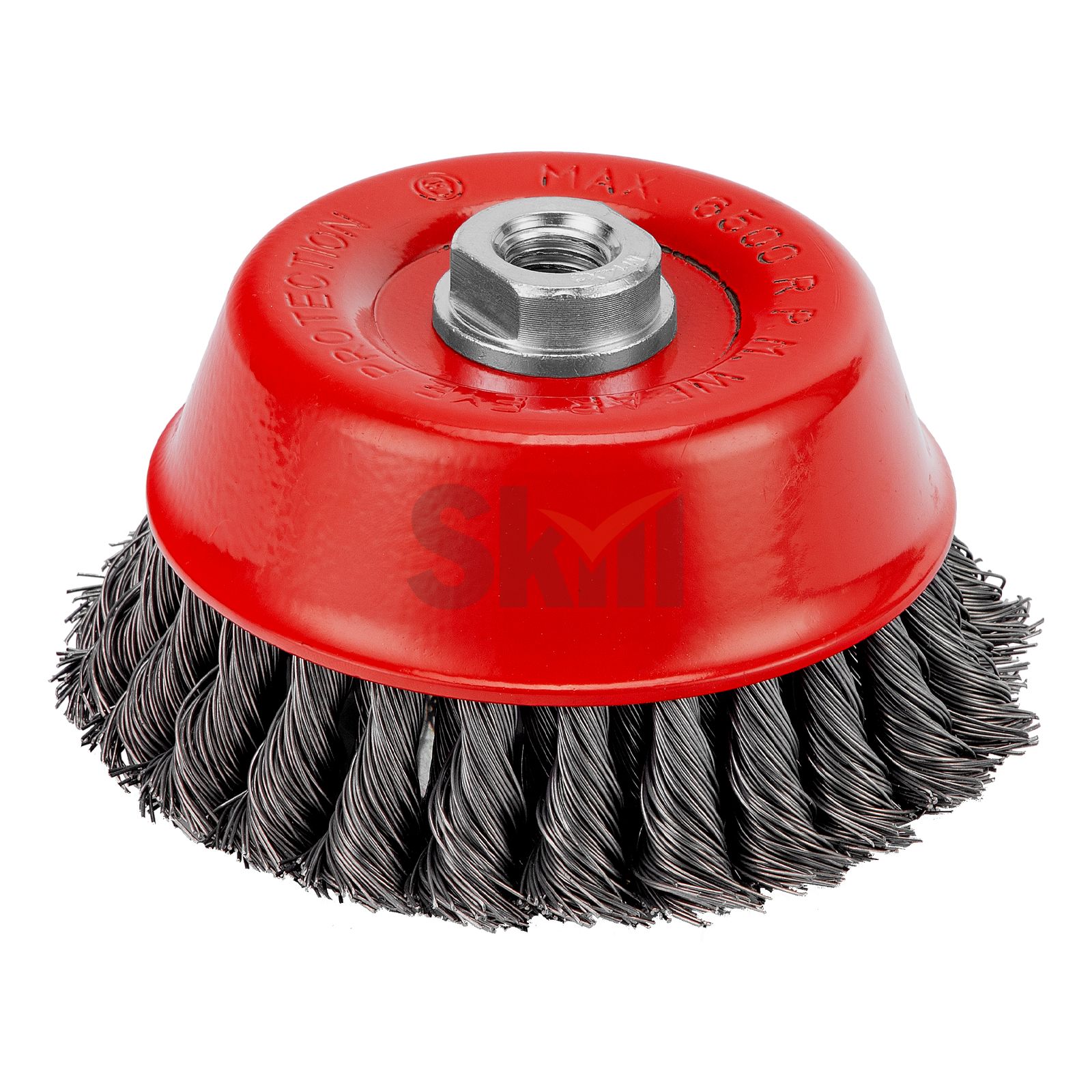 Двухрядная щетка Matrix «Чашка» 74683 диаметром 125 мм, с щетиной из крученой проволоки толщиной 0,5 мм, устанавливается на вал углошлифовальной машины с помощью гайки М14. Рекомендованная максимальная скорость вращения — до 6500 об/мин. Оснастка оптимальна для грубой (черновой) обработки: снятия старого слоя лакокрасочного покрытия и ржавчины, удаления загрязнений, зачистки сварных швов. Эффективно справляется с зачисткой больших поверхностей, подходит для выполнения работ повышенной сложности.