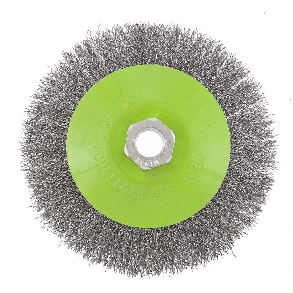 Щетка для УШМ «Тарелка» Сибртех 746167, М14, 125 мм, с щетиной из витой проволоки толщиной 0,3 мм, применяется для очистки металлических, деревянных и пластиковых поверхностей от ржавчины, старых лакокрасочных покрытий и загрязнений. Очищает как плоскости, так и труднодоступные места, поэтому оптимальна для обработки изделий сложной формы. Подходит для придания материалу шероховатости и матовости. Щетка устанавливается на вал углошлифовальной машины и выдерживает вращение со скоростью до 12500 об/мин, что обеспечивает высокую производительность оснастки. Во время работы следует использовать средства индивидуальной защиты. Щетка пригодится для проведения ремонта и решения бытовых задач.