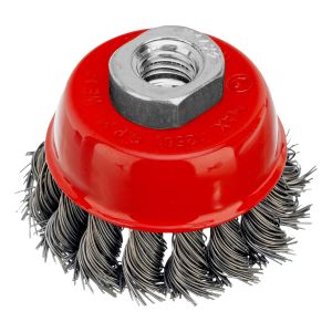 Щетка Matrix «Чашка» 74620 диаметром 65 мм, с присоединительной резьбой М14, с щетиной из крученой проволоки диаметром 0,5 мм, устанавливается на УШМ, поддерживающую работу со скоростью 12500 об/мин. Изделие предназначено для грубой (черновой) обработки поверхностей, подходит для удаления загрязнений, снятия толстого слоя ржавчины, ЛКМ, зачистки сварных швов.