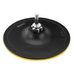 Тарелка опорная Denzel 76255 диаметром 150 мм, с липучкой и адаптером с М14 на d8, твердая, устанавливается на дрель или углошлифовальную машину (УШМ). Используется для крепления абразивных или полировальных кругов на ворсовой основе, позволяет подготовить поверхность для дальнейшей обработки или придать ей финишную гладкость.